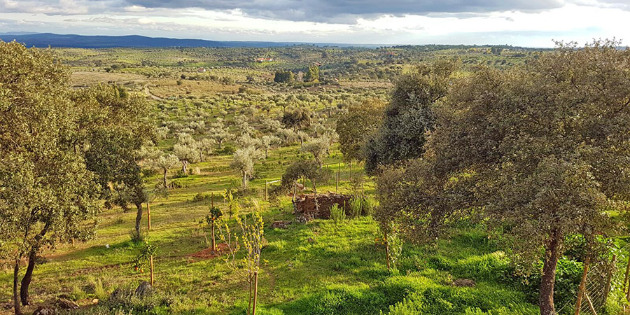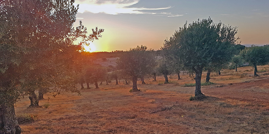 Unser Olivenhain hat eine Grösse von 157‘000 m² und umfasst ca. 2000 Olivenbäume. Es ist ein traditionell angelegter Olivenhain mit sicher mindestens 70 Jahre alten Olivenbäumen. Teilweise ist er terrassenförmig gebaut worden, da das Grundstück in etwas erhöhter Lage und nicht ganz flach ist. Im Weiteren gibt es sehr viele Eichen – hier nennt man sie Azinheiros – und auch ein paar wildgewachsene Pinien und auch Korkbäume.